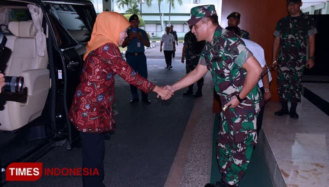 TIMES Magetan/Pangdam V/Brawijaya, Mayjen TNI Wisnoe, P.B, menyambut kedatangan Gubernur Jatim, Khofifah Indar Parawansa di Makodam V/Brawijaya, Rabu (20/2/2019).(Foto: Istimewa)